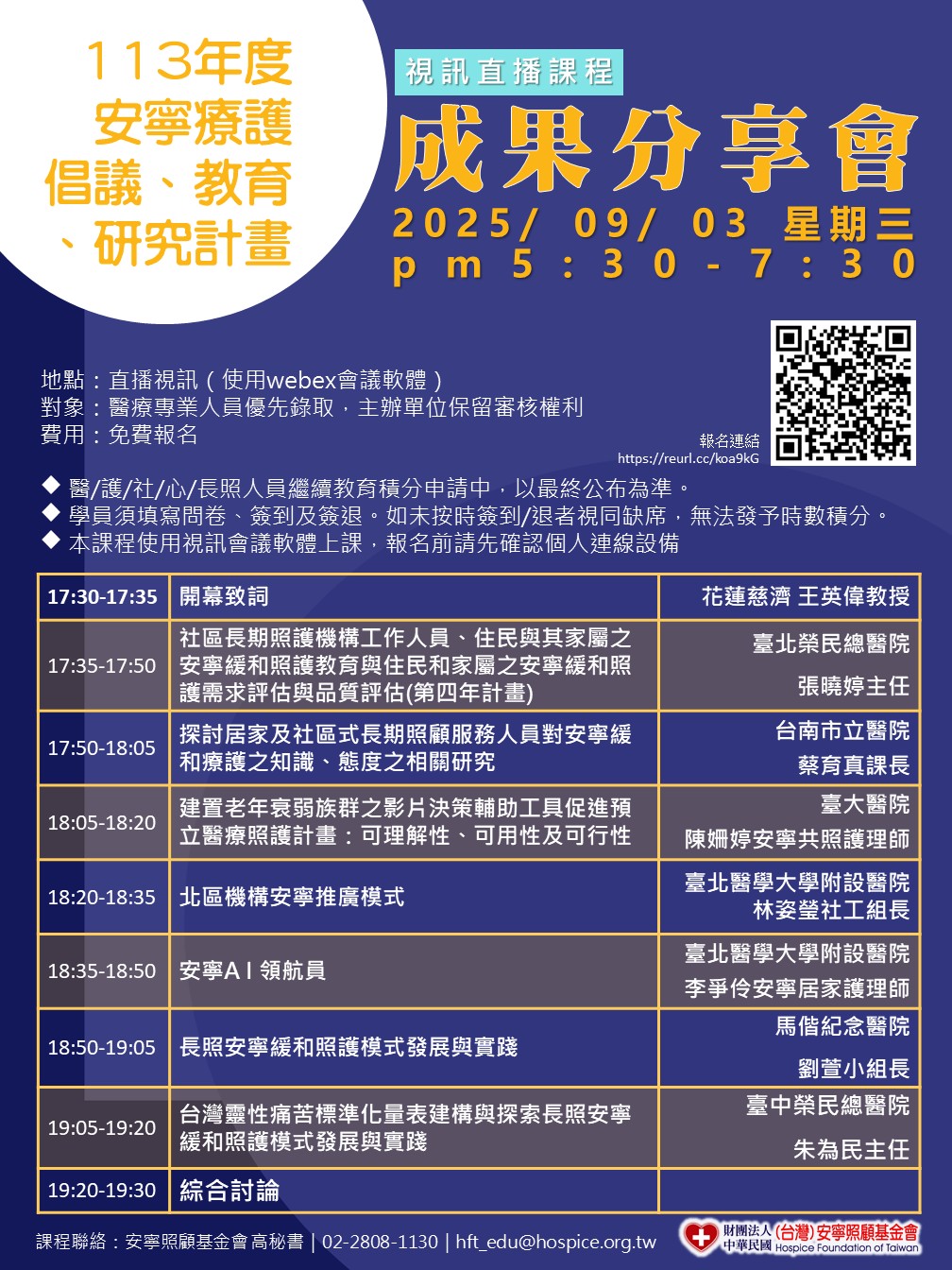 113年度「安寧療護倡議、教育、研究計畫」成果分享會(視訊直播)|報名額滿