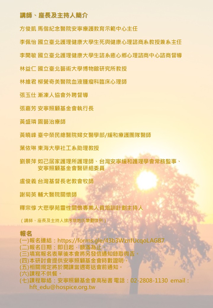 《課程對象》 1.從事照顧工作之工作人員 2.對安寧、靈性議題有興趣的社會大眾