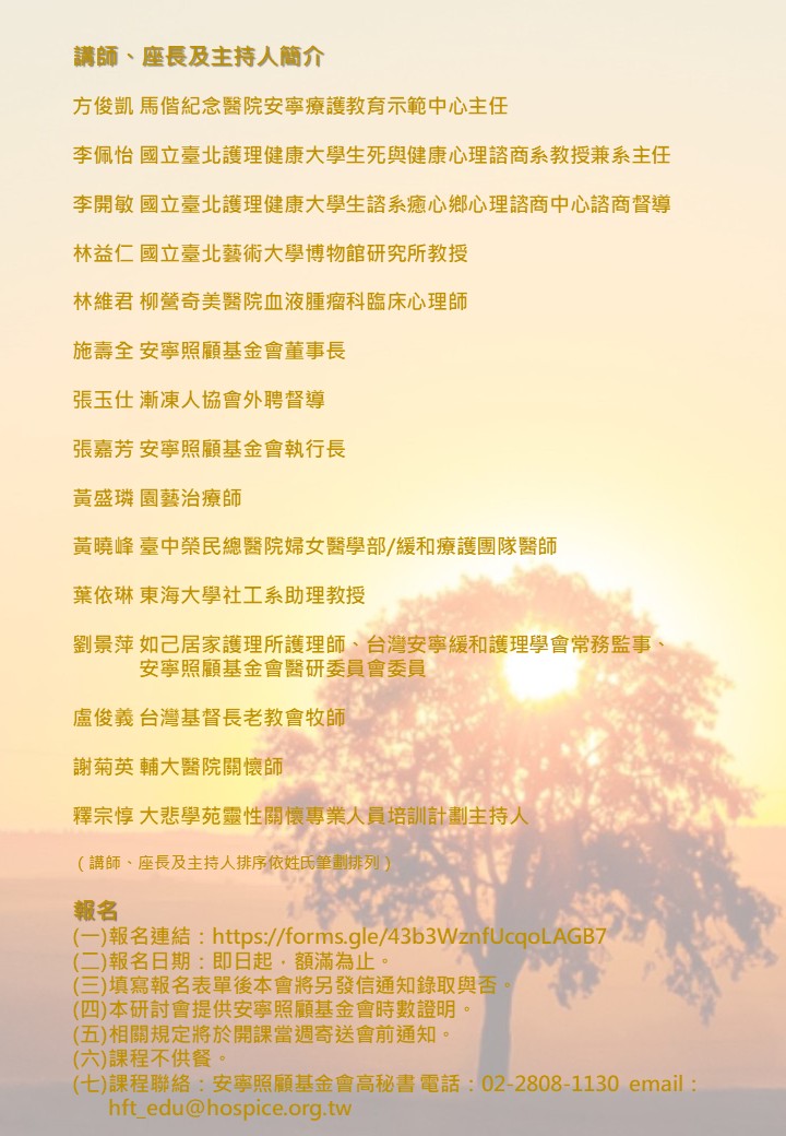 (五)課程聯絡:安寧照顧基金會高秘書 電話:02-2808-1130 email:hft_edu@hospice.org.tw