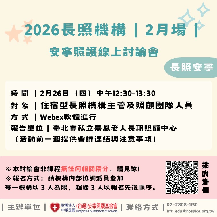 安寧照顧基金會開設長照機構安寧照護線上討論會,邀請有意願推動安寧照護經驗的住宿型長照機構主管及照顧團隊人員,及有興趣長照安寧議題的醫事人員,參與此討論室互相學習交流,為長照機構夥伴們建置一個專業安全的交流平台。