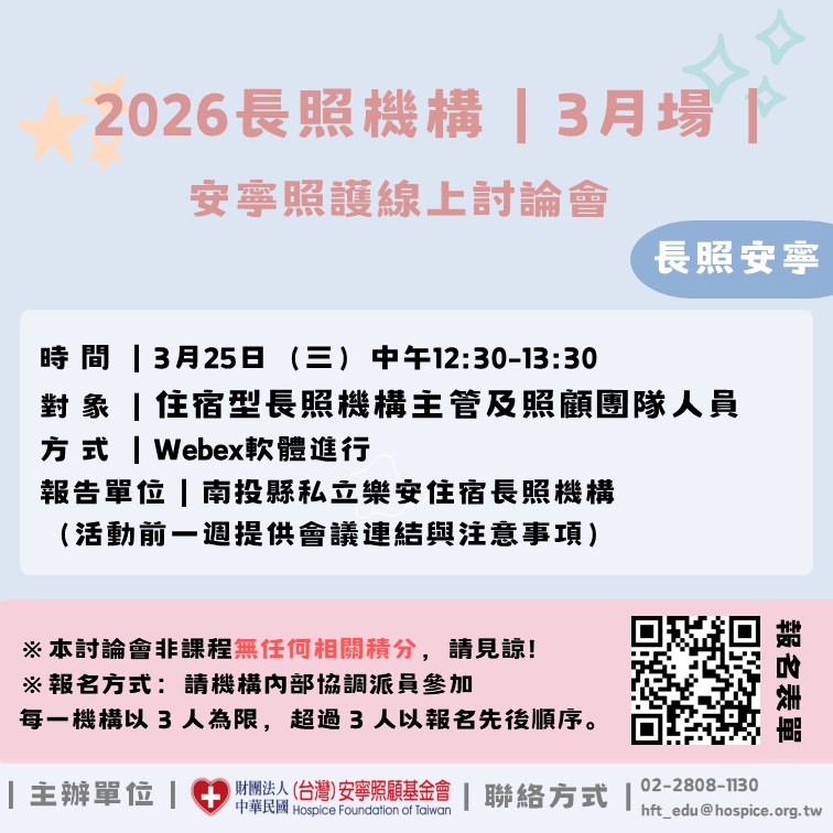 安寧照顧基金會開設長照機構安寧照護線上討論會,邀請有意願推動安寧照護經驗的住宿型長照機構主管及照顧團隊人員,及有興趣長照安寧議題的醫事人員,參與此討論室互相學習交流,為長照機構夥伴們建置一個專業安全的交流平台。