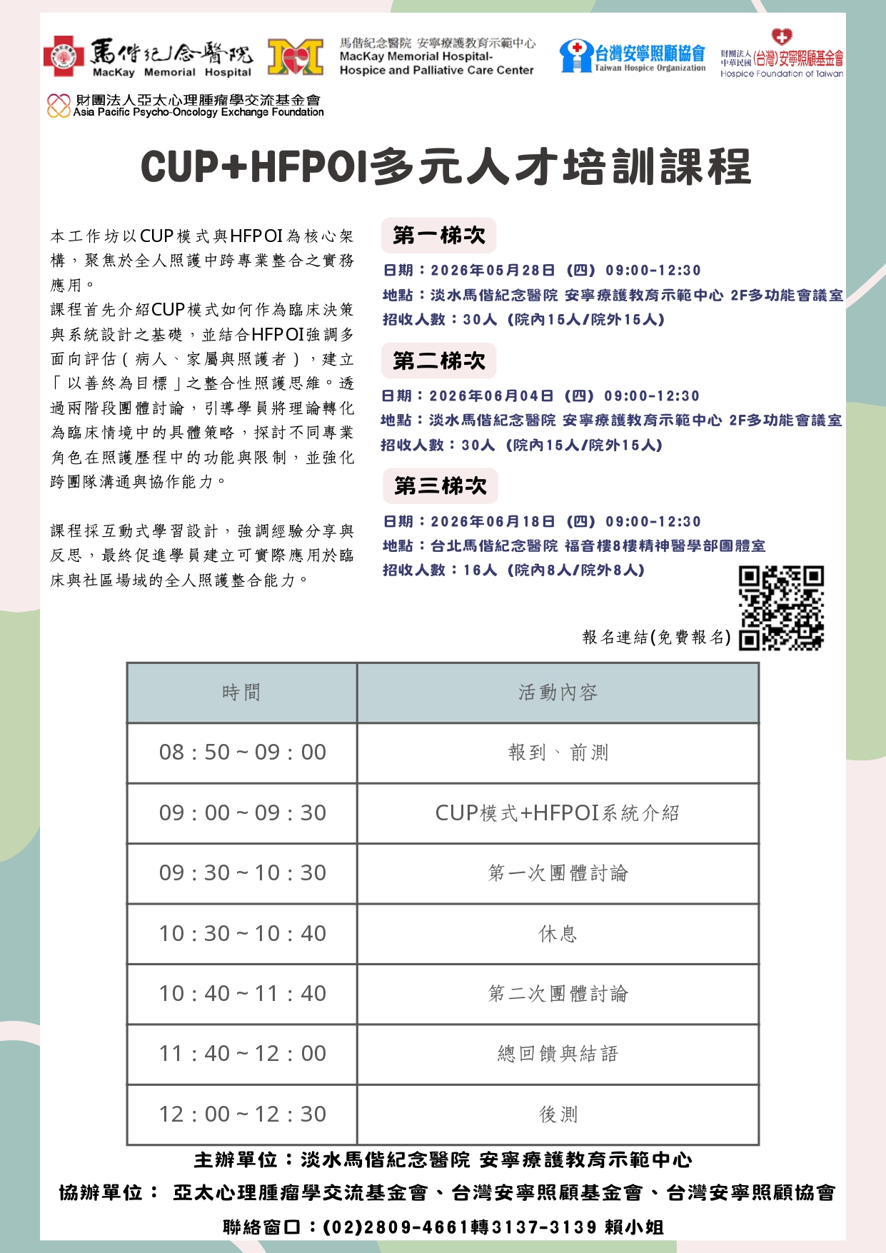 本課程採互動式學習設計,強調經驗分享與反思,最終促進學員建立可實際應用於臨床與社區場域的全人照護整合能力。