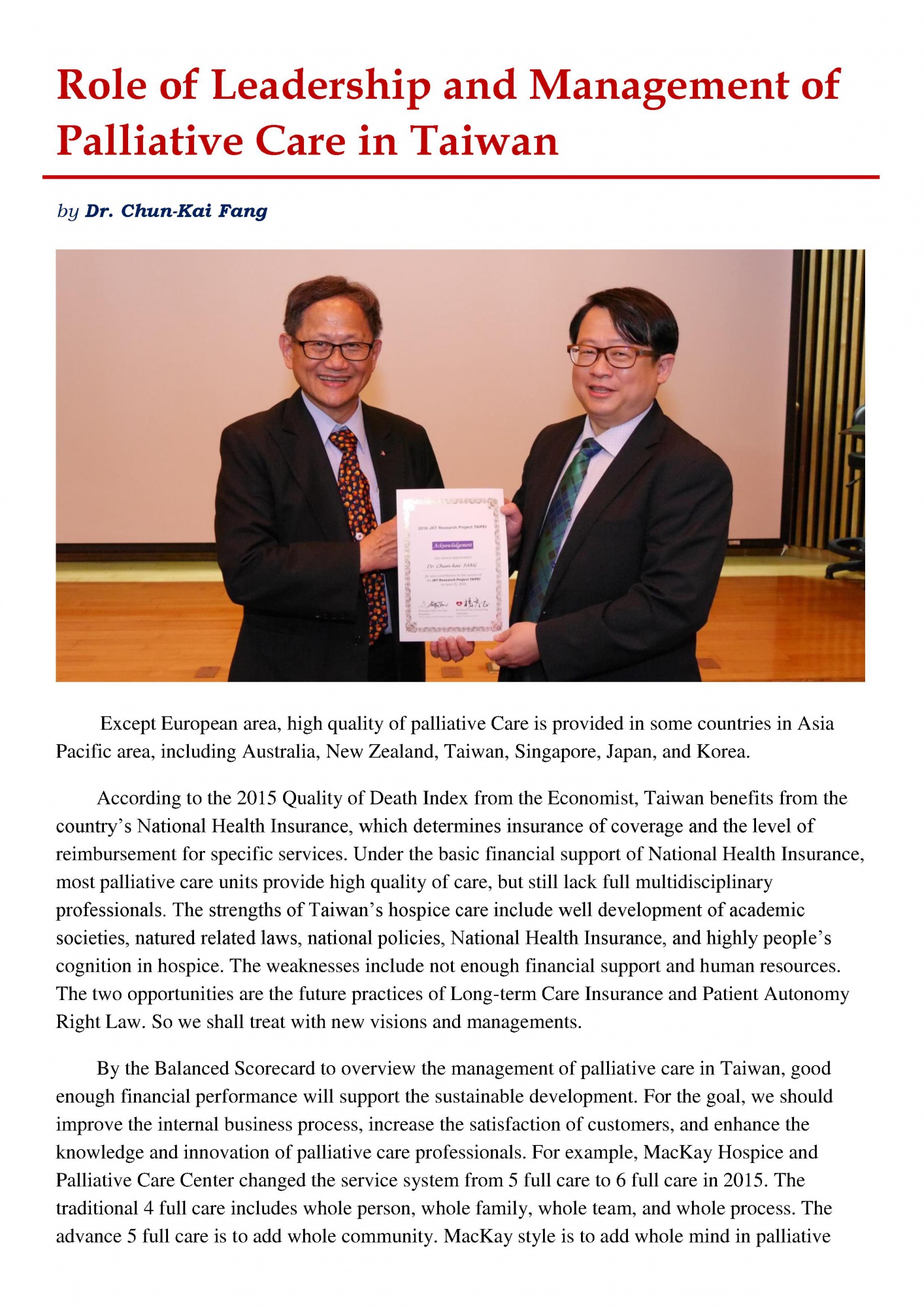 According to the 2015 Quality of Death Index from the Economist, Taiwan benefits from the country’s National Health Insurance, which determines insurance of coverage and the level of reimbursement for specific services. Under the basic financial support of National Health Insurance, most palliative care units provide high quality of care, but still lack full multidisciplinary professionals. The strengths of Taiwan’s hospice care include well development of academic societies, natured related laws, national policies, National Health Insurance, and highly people’s cognition in hospice. The weaknesses include not enough financial support and human resources. The two opportunities are the future practices of Long-term Care Insurance and Patient Autonomy Right Law. So we shall treat with new visions and managements.
