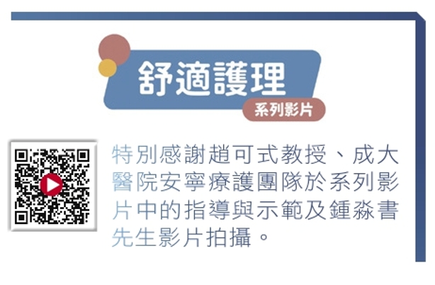 台灣安寧緩和護理學會與安寧照顧基金會近期合作推出《舒適護理系列影片》,由台灣安寧之母、成功大學醫學院名譽教授趙可式指導監製,成大醫院安寧團隊示範,透過簡單易解的說明,輔以擬真情境示範的方式,一一傳授臨床上與長照居家情境常見的舒適照顧技巧。