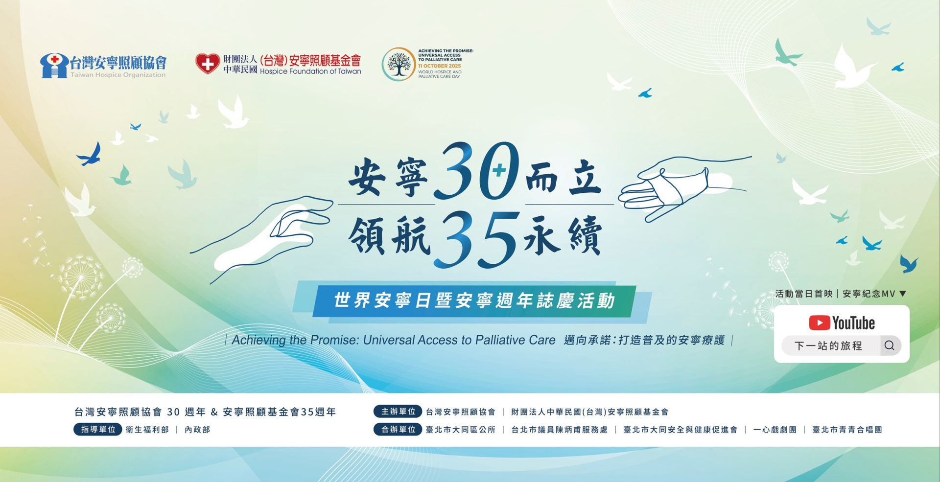 適逢今年世界安寧日主題「邁向承諾:打造普及的安寧療護」(Achieving the Promise: Universal Access to Palliative Care),台灣安寧照顧協會(30週年)與安寧照顧基金會(35週年)兩大推手,睽違多年再次攜手,將於 10月18日(六)下午2點至5點,在大稻埕永樂廣場共同舉辦「安寧三十而立 領航三五永續」-2025世界安寧日暨安寧週年誌慶活動,宣示啟動「善終平權」新里程碑。