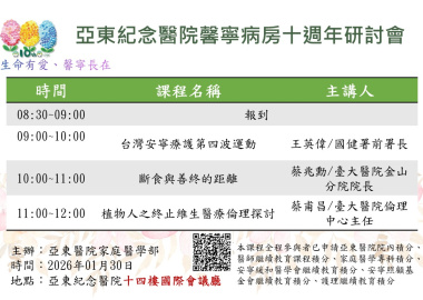 因應臺灣邁入超高齡社會,生命末期照護所面臨的政策、倫理與臨床實務挑戰日益多元且複雜,本研討會整合政策發展、臨床照護與倫理法制三大面向,回應當前安寧緩和療護的重要關鍵議題。透過介紹「... 閱讀更多