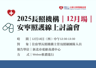 安寧照顧基金會開設長照機構安寧照護線上討論會,邀請有意願推動安寧照護經驗的住宿型長照機構主管及照顧團隊人員,及有興趣長照安寧議題的醫事人員,參與此討論室互相學習交流,為長照機構夥伴們建置一個專業安全的交流平台。