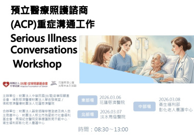 本工作坊聚焦於「重症溝通(Serious Illness Conversations, SIC)」,培養醫療照護專業人員在預立醫療照護諮商中,提供一套結構化的方法與溝通語言,能以更貼近臨床現場的方式,與重症病人及其家屬深入討論其價值觀、目標與照護選擇。