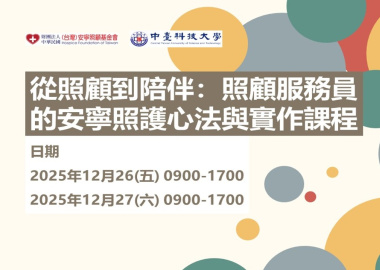面對生命末期的照顧,照顧服務員是陪伴病人與家屬最前線的重要角色。本課程以安寧療護理念為核心,結合課堂講授與實務操作,協助照顧服務員了解末期病人的身體變化與需求,學習以尊重、關懷與專業的方式,提供舒適、安全與有尊嚴的照護。透過講師豐富的臨床照顧經驗,以課程教授及實務操作練習,讓學員在實務工作中能以更敏銳的覺察與更溫柔的照護,陪伴病人安適走完生命旅程。 《主辦單位》中臺科技大學、財團法人中華民國(台灣)安寧照顧基金會